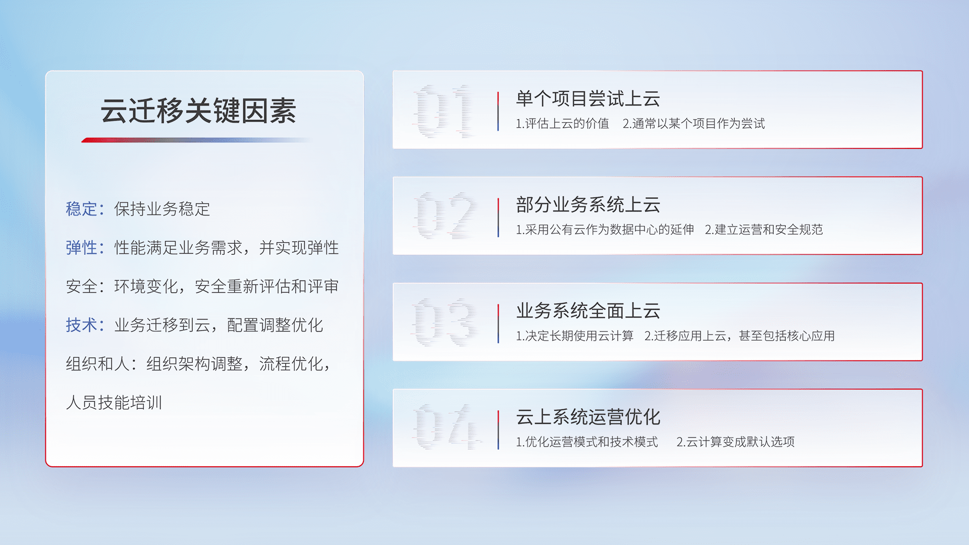 结合实际业务,,从规划设计、、、云平台选型、、、、云原生改造、、数据迁移、、、集成交付,,,迁移全过程为客户识别最佳上云路径,,做好风险识别管理,,,,设计网络架构、、、、身份权限、、、安全审计合规、、、、操作审计、、、、日志审计、、监控告警策略、、、多站点容灾设计等,,,,对云上基础设施进行整体规划,,,提升IT治理水平,,,以满足弹性、、高可用、、、、高性能的需求。。